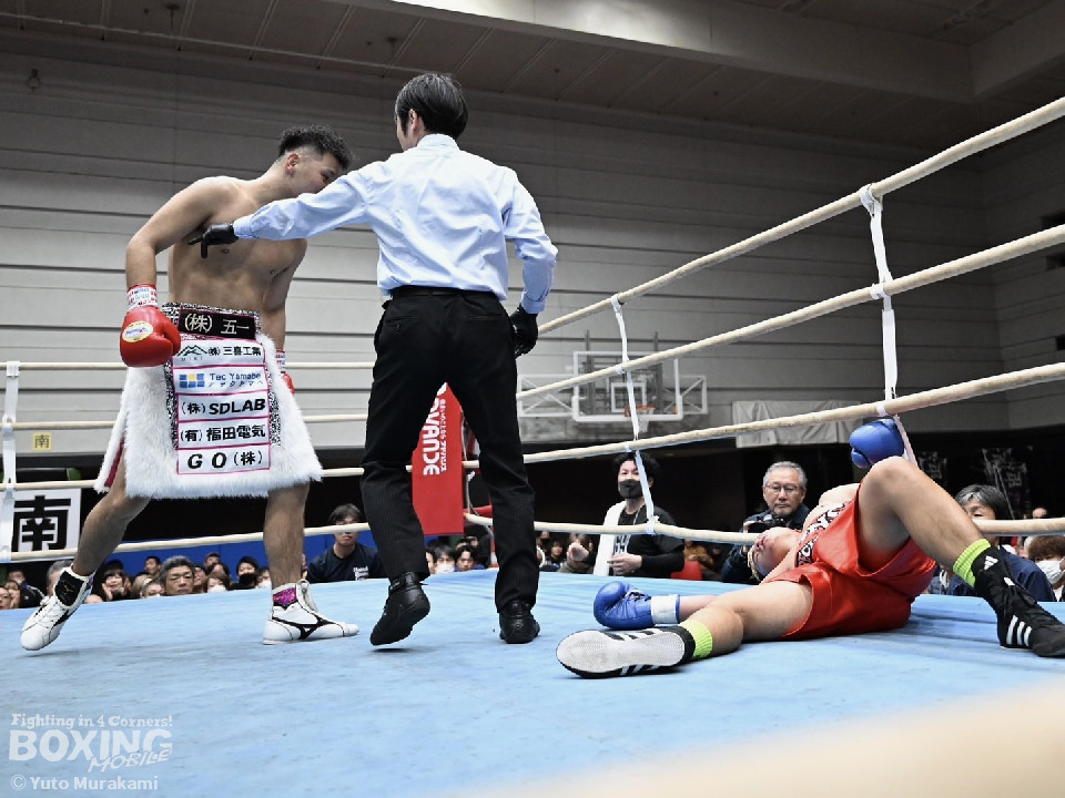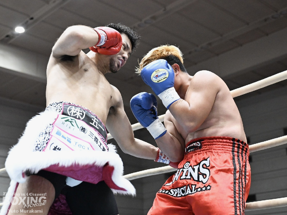 矢野がジリジリと距離を詰めながら、ワンツー、左ボディで先制攻撃。2回、サウスポー・ピーラポンは右フックを合わせるが、矢野は冷静に対応。ラウンド終了間際、矢野は左フックで痛烈に倒して、ピーラポンに10カウントを聞かせた。
