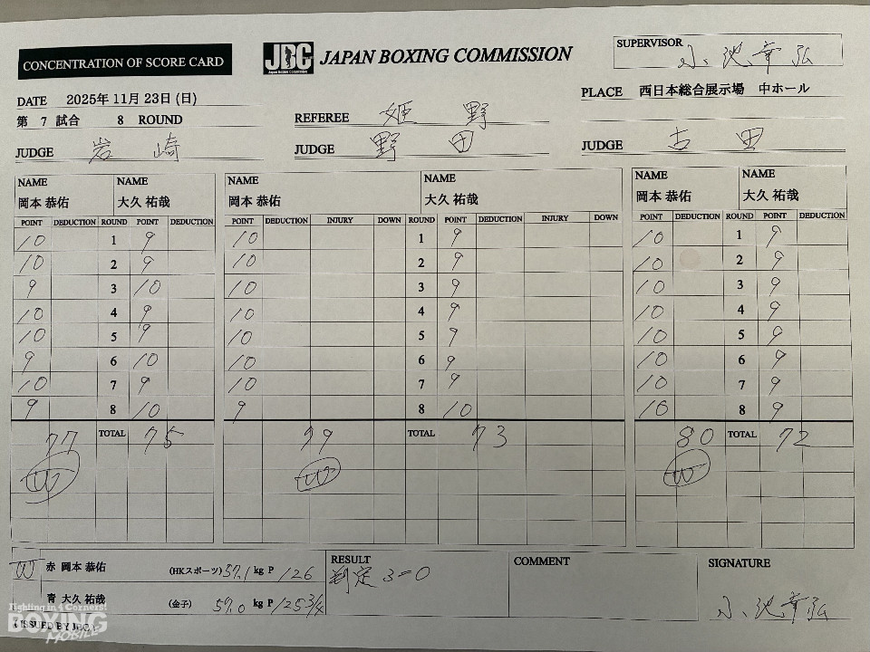岡本は2回に右アッパーで鼻血を流させると、ジャブを軸にコントロール。大久の左フックをボディワークでかわして、リズム感のある攻撃。中盤になっても運動力を落とさず、ワンツー、左ボディを決めてポイントを連取した。最後まで前進する大久を振り切って、試合巧者ぶりを発揮した。