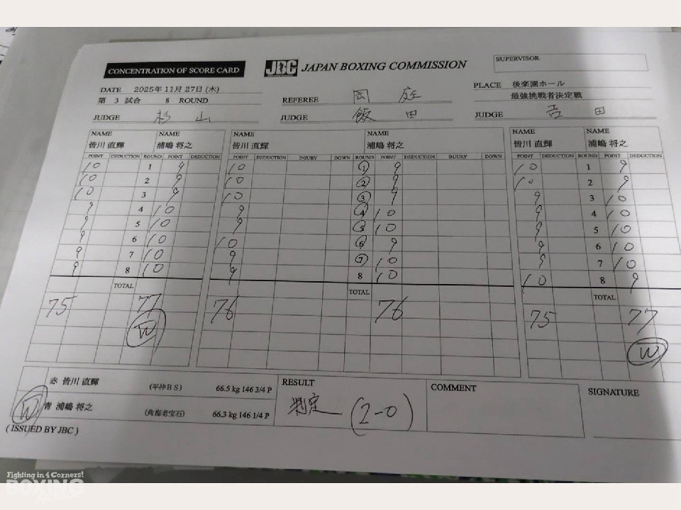 一方、皆川は「3ラウンド目に左手小指を骨折してしまい、倒せると思い込んで強振ばかりになってしまった。自分の傲慢さが出た」と悔しさを明かし、「浦嶋選手の突進力と努力には敬意を表したい。ぜひ、セムジュに勝ってほしい」と勝者へエールを送った。