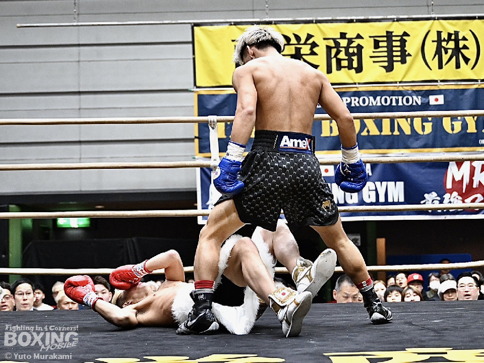 サウスポー同士の一戦は、互いに距離とタイミングを測る慎重な立ち上がり。しかし、その均衡を破ったのは宮里だった。左クロスを鋭く打ち抜き、痛烈なダウンを奪取。レフェリーは、ノーカウントで試合をストップした。