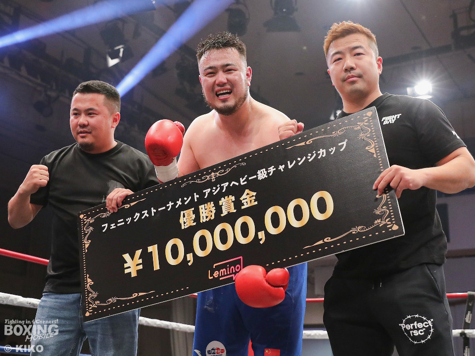 優勝賞金1000万円が懸かったフェニックストーナメントアジア・ヘビー級チャレンジカップ決勝戦が18日、後楽園ホールで開催された「Lemino BOXING フェニックスバトル147」で行われ、大沼ケン(21=角海老宝石)とマハンハイリー・ヌールタイ(24=中国)が激突、会場が大いに盛り上がった。