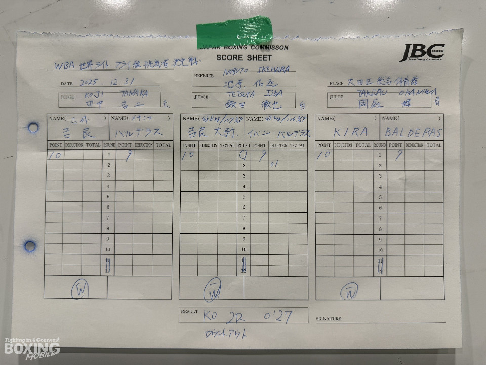 イバンの左ジャブに対し、右ストレートをカウンターに合わせた吉良がダウンを奪うと、レフェリーが10カウントを数え上げて、ノックアウト勝利。来年の世界挑戦に大きな弾みをつけた。