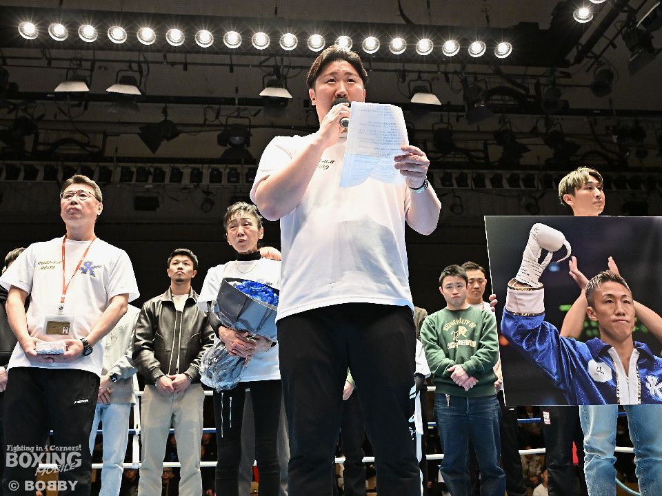 続いてマイクを握った昌冶さんは、弟の歩みとジムへの想いを振り返った。「弟は2023年、このパイオニアオブファイトで日本ランキングを獲得しました。このリングで引退式をさせていただけることに、心から感謝しています。シゲは中谷潤人君から多くの刺激を受け、心から尊敬していました。その背中を追いかけ、いつか追いつきたいと自分を律して取り組んでいました」と、弟の歩みとジムへの想いを振り返った。