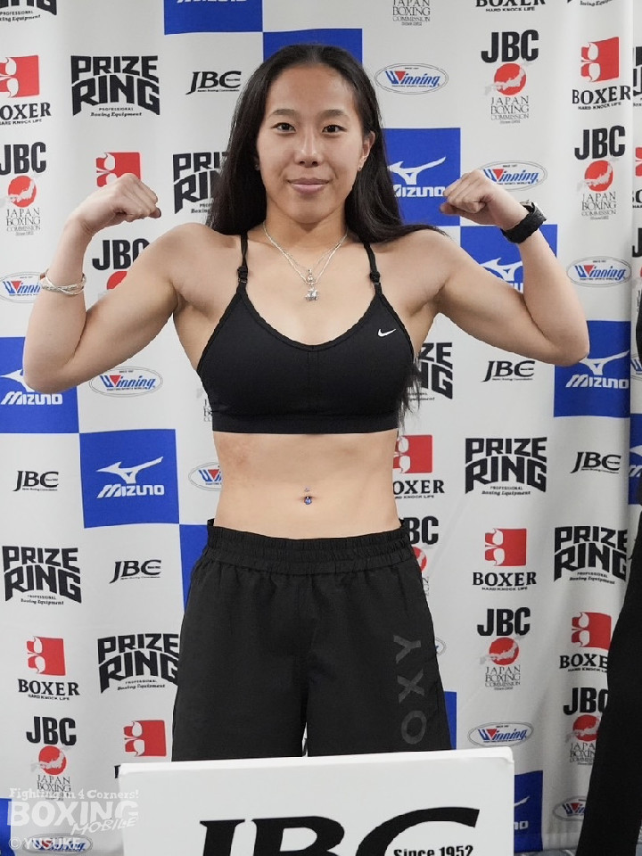 一方、プロ5戦目でタイトル初挑戦の西は、600gアンダーの56.5sでパス。3週間前に髪を短くカットし、実戦仕様で臨む。「スパーリングで髪が引っかかってしまうので切った」と理由を明かした。
