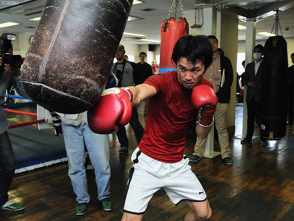 会見を終え、公開練習に移った山中はシャドーボクシングで身体をしっかりと温めると、WBO世界バンタム級10位マルロン・タパレス(比)をパートナーに2ラウンドのスパーリングを行った。