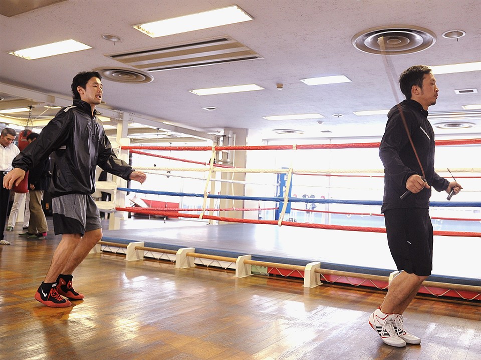 公開練習で山中と粟生は、シャドーを中心に汗を流した。重心をしっかりと意識し、1つ1つを確認すように動き、1ヶ月振りの練習にも関わらず、2人の世界王者は"切れ"のあるワンツー・右フックを放っていた。