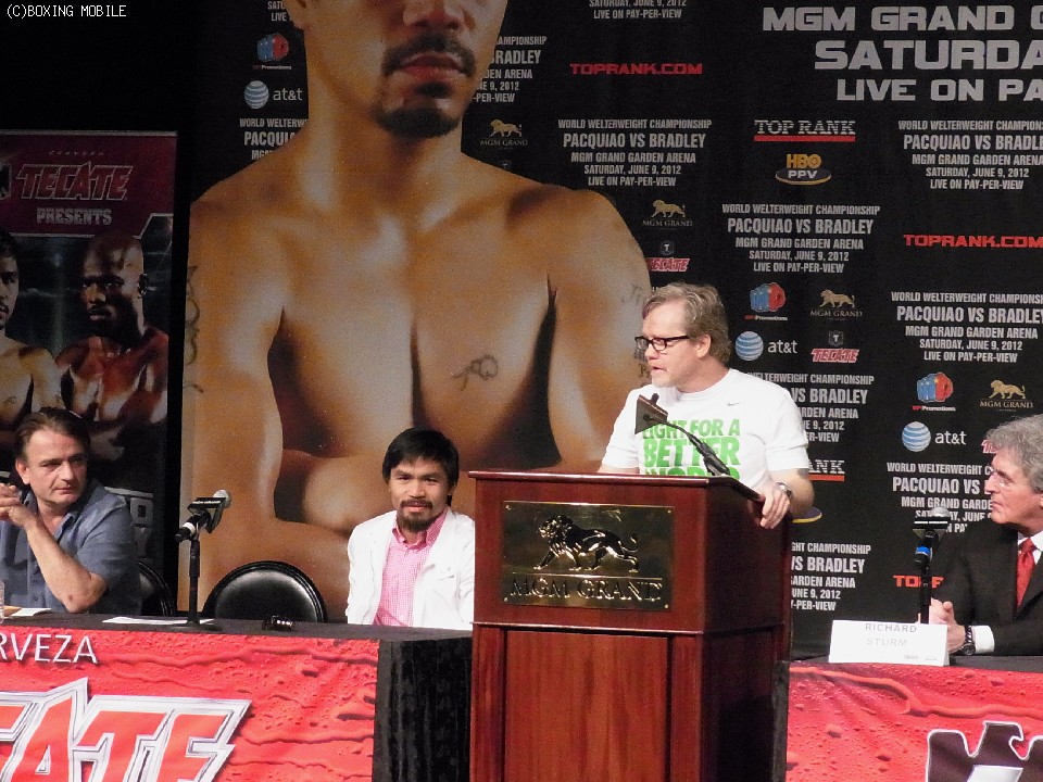トップランク社のボブ・アラム氏の紹介で最初に壇上にあがったのは、ブラッドリーのトレーナーを務めるジョエル・ディアス氏。「ボクシングは時に大番狂わせが起こる。今週末には10年に一度の大番狂わせが起きるので見逃さないように。」と話すとパッキャオのトレーナーで世界最高のトレーナーとも言われるフレディ・ローチ氏は「ブラッドリーは無敗で強敵ではある。しかし、こちらもいろいろとありながらも100%に仕上げてきたので当日結果がどうなるか楽しみだ」とコメント。
