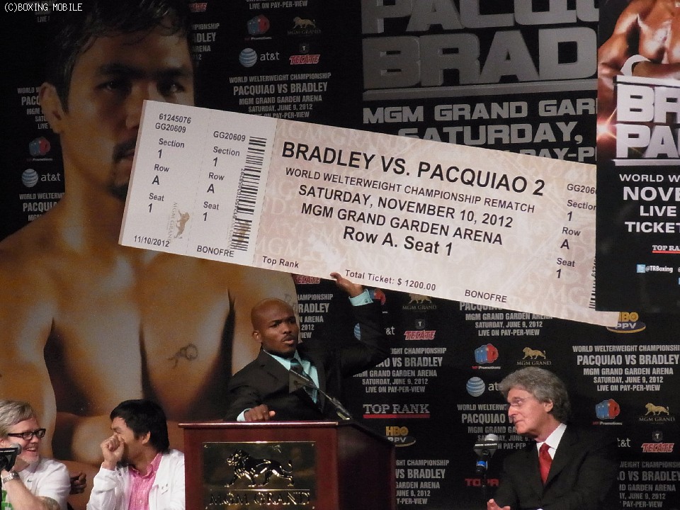 挑戦者でWBO世界スーパーライト級王者のティモシー・ブラッドリーは「トレーニングキャンプは地獄のようだった。こんなに練習をしたことがないぐらい練習したので、準備は出来ている」とコメントすると、勝利した場合に内定しているとも言われている再戦のポスターと特大チケットを披露した。