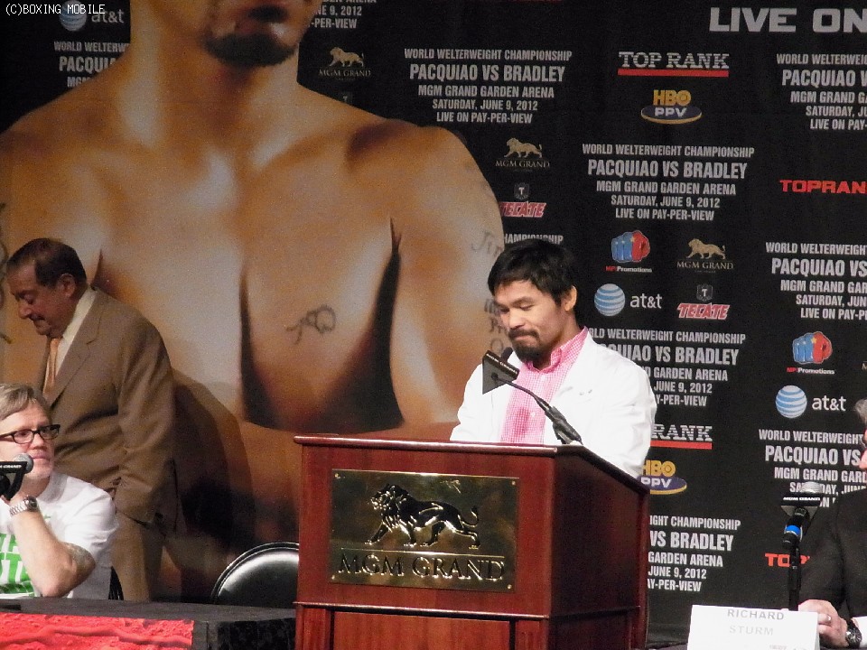 そして最後に上がったパッキャオはブラッドリーのコメントを皮肉り「トレーニングキャンプは天国だった」と集まったメディア関係者の笑いを誘いつつも「ブラッドリーはまだ若くてハングリー。だから周りに止められるほど練習をしてきた。すばらしい試合になると思う」と話した。