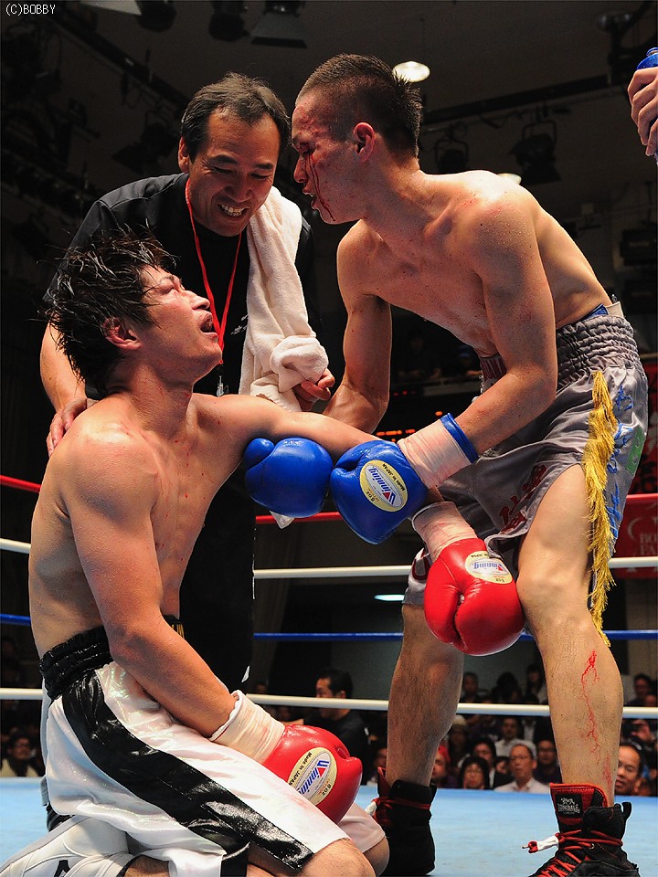 遂に試合終了のゴングが鳴り、万感の想いでキャンバスに泣き崩れた額賀。それをまっさきに抱え起こしたのは、額賀の健闘を称えた平山だった。