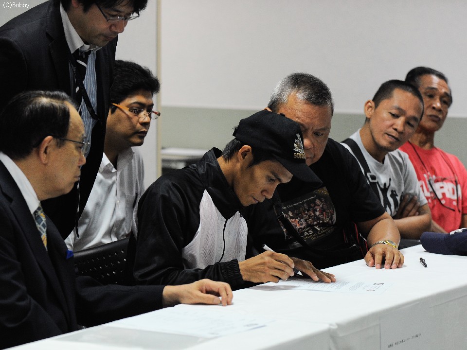 横浜文化体育館で開催されるWBC世界スーパーフライ級タイトルマッチ、王者"みちのく魂"佐藤洋太(協栄)VS挑戦者シルベスター・ロペス(比国)の一戦を目前に控えた6日、都内で調印式と前日計量が執り行われた。