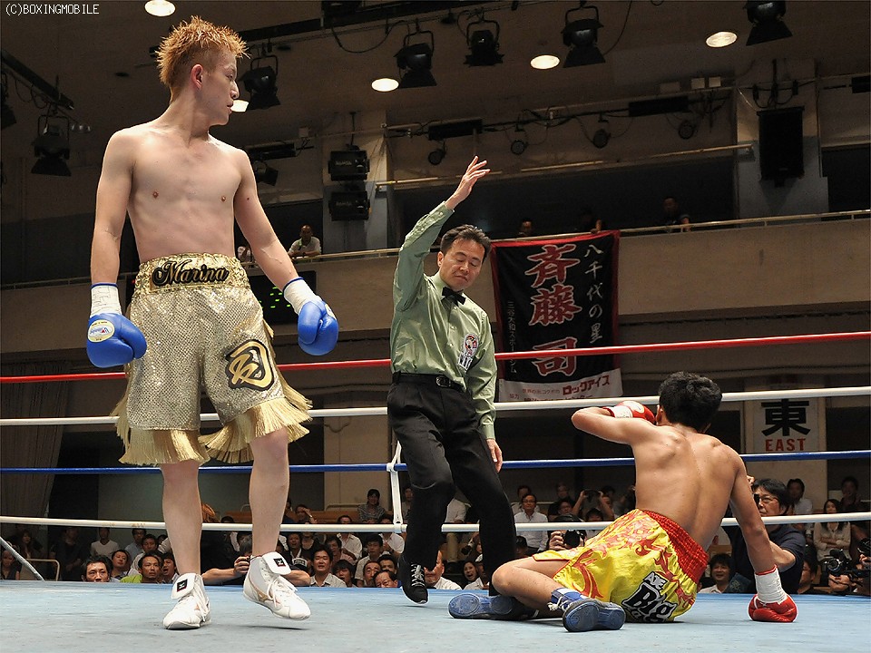 立ち上がり、斉藤はステップでリズムを作り、鋭いジャブから右ストレートを突き刺し、早くもラジャクルからダウンを奪う。そして2R、試合の主導権を握った斉藤は、強引に詰めるラジャクルからカウンターの右ストレートでダウンを追加すると、右アッパー・左フックで立て続けにダウンシーンを演出する。何とか立ち上がるタイ人だが、斉藤の右ストレートを浴びると力なくキャンバスに崩れ落ちた。