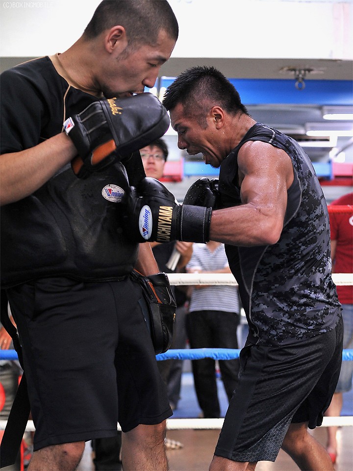 今日から本格的な練習となったが、内山はアップとなった4ラウンドのシャドーでは鋭い踏み込みからワンツー・左ボディ・右ストレートと回転の速い連打を繰り出し、佐々木トレーナーとのミット打ちでは、"KO Dynamite"の剛打が炸裂する度に報道陣の視線はリングに釘付けとなった。