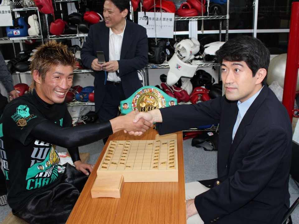 13日、都内にある協栄ジムにてWBC世界スーパーフライ級王者の佐藤洋太が、報道陣を招き公開練習を行った。将棋界から森内俊之名人がサプライズ登場。
