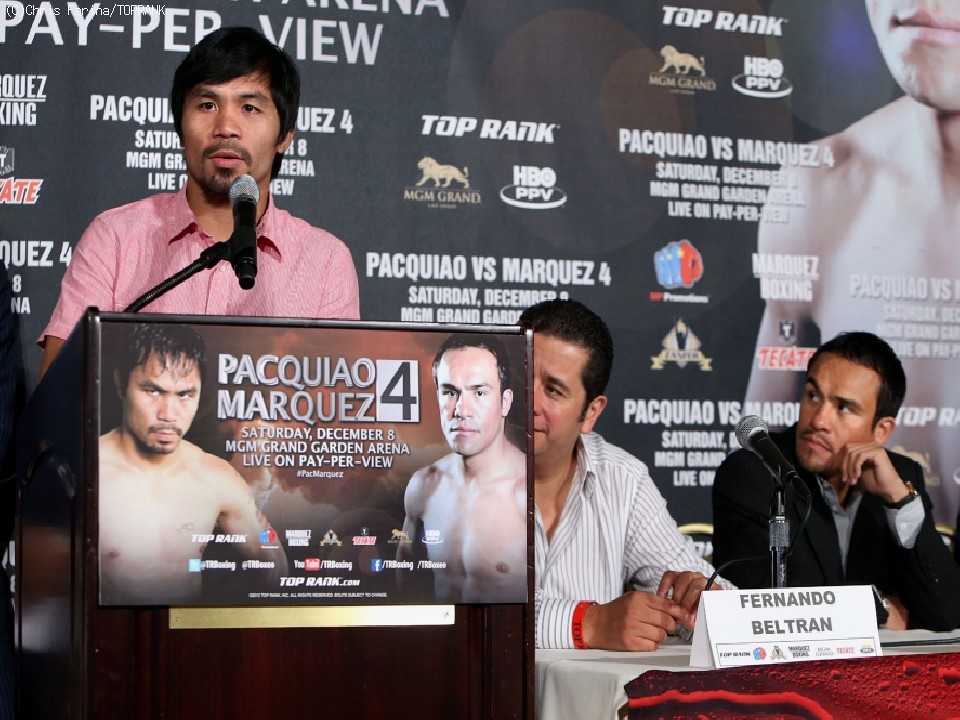 12月8日、米国ネバダ州ラスベガスのMGMグランドガーデン・アリーナで開催が決定したマニー・パッキャオ(比)対ファン・マヌエル・マルケス(メキシコ)の第4戦。この試合に向けて両者が17日(日本時間18日)、カリフォルニア州ビバリーヒルズで会見に臨んだ。