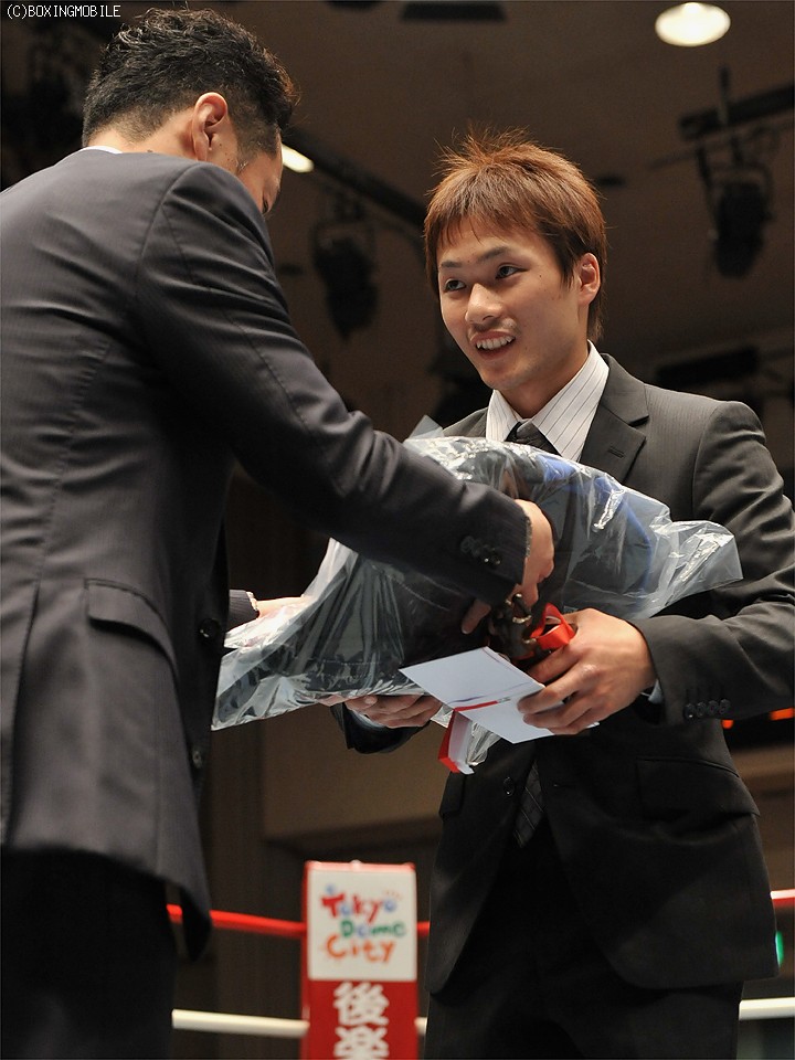 27日、後楽園ホールで開催された東日本新人王準決勝のリング上では、8月度月間賞MVP・赤穂亮(横浜光)、敢闘賞・大竹秀典(金子)、新鋭賞・松尾雄太(国際)の表彰式が行われた。