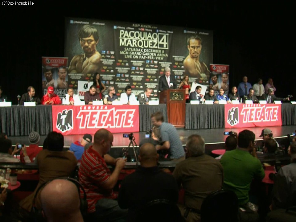 トップランク社の社長で、今回の試合のプロモーターであるボブ・アラム氏から紹介されたマニー・パッキャオ(比)は記者団を前に壇上で挨拶し「土曜日は激しい動きのあるいい戦いになるだろう。マルケスは、彼自身が強いことを証明する必要がある。誰にも疑われない勝利を手に入れる。」と静かに語った。
