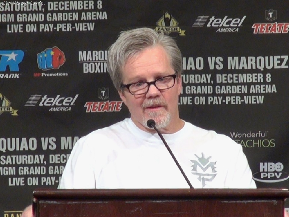 落胆の表情で、「試合展開はよかったと思うが、マルケスのパワーは上がっていたし、いいKOだったよ」と話した。またパッキャオの進退について聞かれると、「しばらく落ち着いてから考えるが、もしかしたら引退することになるかもしれないし、また再戦するかもしれない。マニーがどうしたいか話し合わないといけないね。ただし、続けることになってもジムで以前のマニーの動きではなかったらやめさせるかもしれない」と今後のパッキャオの動向が気になるところだ。