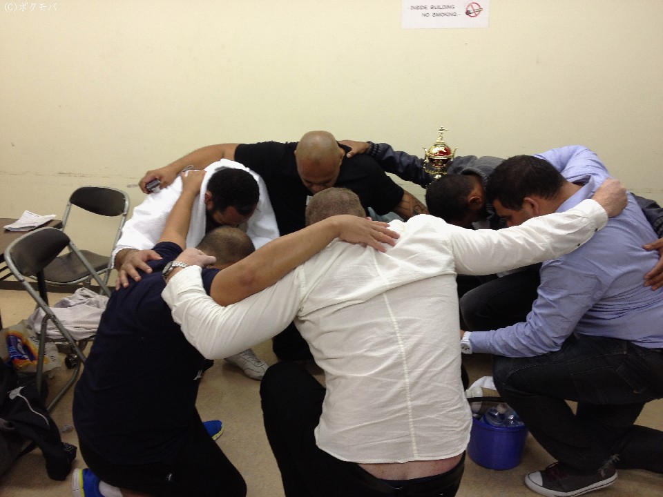 試合後の控室で、チームで円陣を組んで御祈りをささげた後に会見に応じたソロモン。一問一答