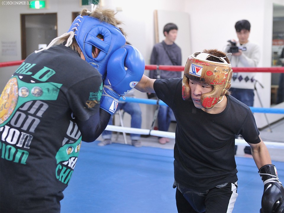 会見終了後、今年の練習始めとなった佐藤だが、大晦日から2週間振りのジムワークにも関わらず"スパーリング中毒者"の本領発揮。同門で"協栄の最終兵器"前川龍斗とバンタム級6回戦・佐藤鋼太をパートナーに6ラウンドの公開スパーとなった。
