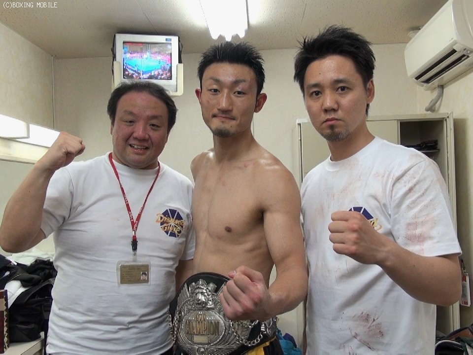 「皆さんの期待と、三迫ジムがバックアップしてくれました。ほんとに嬉しいです!!」リング上でインタビューを終えた小原は、控え室に戻ると、「1テンポ早く出ようと思ってた。最初のフックが入って効いたので、それが起点となって攻めることができました。ここで行かないと長時間やる自信がなかった。そうしたら2Rにもらって誤魔化すことに必死だった」と語ると、「1Rは見る予定だったが、自分の中でタイトルという意識があって攻め気になれたと思う。相手が目尻を切っていたのでポイントを取っていこうと思った。頭に血が上っていたと思ったが、今考えれば冷静だったと思う」と試合を振り返った。