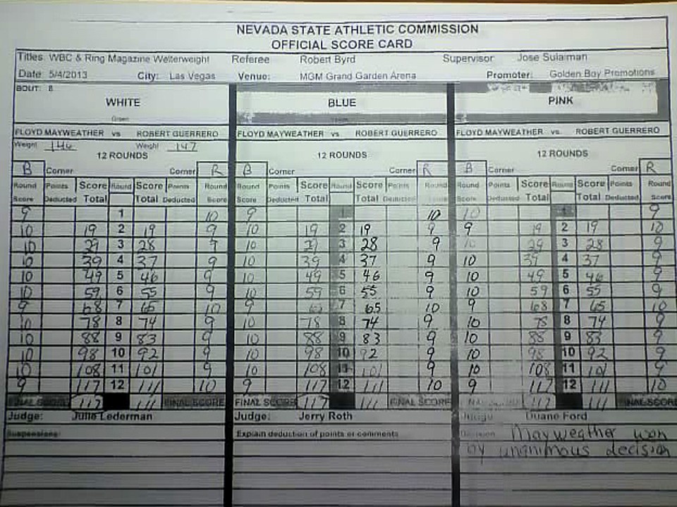 採点はジャッジ三者とも117対111の大差でメイウェザーを支持していた。WBCのウェルター級王座を統一するとともに初防衛に成功したメイウェザーは、これで44戦全勝(26KO)。「ゲレロは本物の戦士だよ。立派に戦ったと思う」と勝者は相手を称えたあと「中盤に右手を傷め、その後は以前ほどシャープに動けなかった」とアクシデントがあったことを明かした。次戦は9月、WBC世界スーパーウェルター級王者サウル・アルバレス(メキシコ)との対決が期待されているが、「9月?アルバレス?いや、どうなるか分からない。いまは少し休みたい」と濁した。暫定王座を失ったゲレロは36戦31勝(18KO)2敗1分2無効試合。「メイウェザーはパンチの外し方が巧みだった。追い詰めることができると思ったのだが、予想以上に速かった」と素直に敗北を受け入れた。