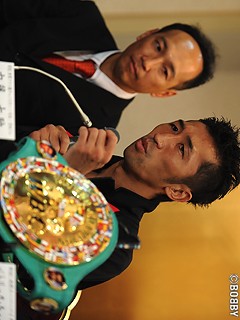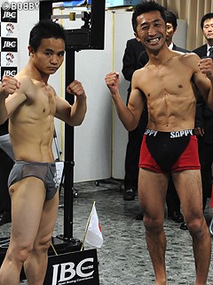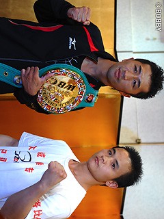 上海大会が中止となり、急遽26日にディファ有明で異例のワンマッチ開催となったWBC世界フライ級タイトルマッチ「王者・内藤大助(宮田)VS挑戦者・熊朝忠(中国)」の調印式と公式計量が25日、都内で行われた。