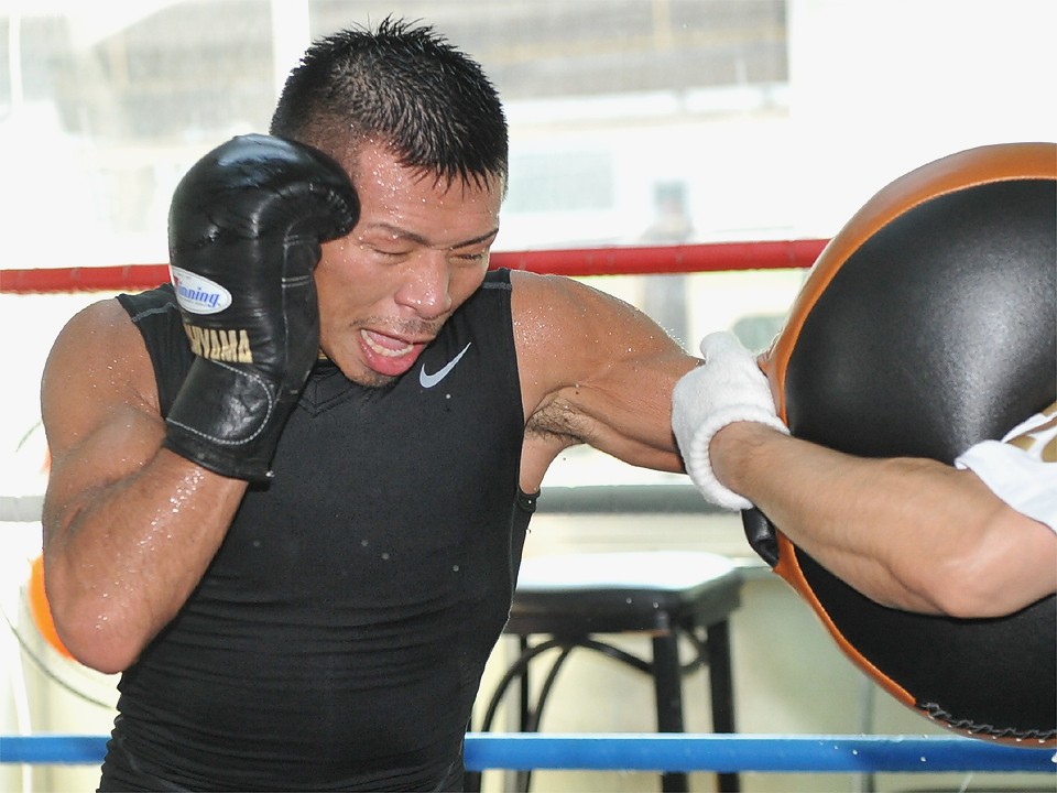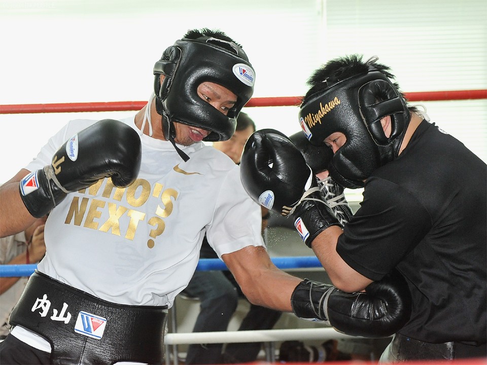練習に移った内山は、ハイデル・パーラ(ベネズエラ)とのV7戦で痛めた右拳にまだ違和感もあり、右は大事をとって軽く、左を主体としたミット打ち、マススパーなど、計10R以上の練習で汗を流した。