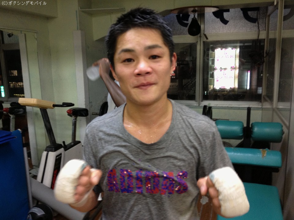 この日、スパーの相手をした村中は「田口さんは普段は優しい人なのに、スパーが始まるとスイッチが入ります」とオンとオフの切り替えがはっきりしている田口に目を向けると「プレスが強くてパンチが硬くて重かった」と、この日チャンピオンとグローブを交えた印象を語った。