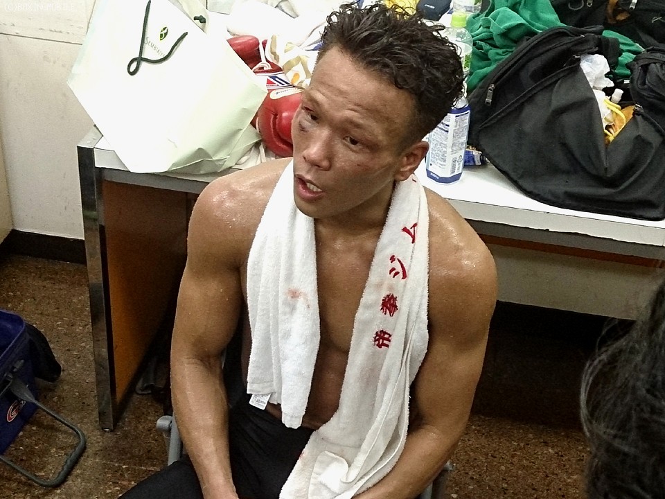 控室に戻ってきた下田の右目上は2センチほど裂け、右目下も赤黒く腫れていた。やや疲れた様子で椅子に座った前世界王者は「パンチは切れていたけれど、相手に粘られてしまった。試合慣れしているなと感じました。左の切れはよかったので、もっと右で煽りたかったけれど、パンチをまとめられませんでした」と手応えと反省を口にした。本田明彦会長は「相手がパンチがあってやりにくいとはいえ、下田自身が中途半端だった」と評した。現在はWBAでフェザー級2位にランクされている下田だが、今後に関しては「どちらでもチャンスがある方で」と話した。33戦28勝(12KO)3敗2分。