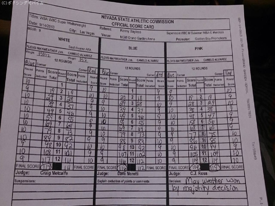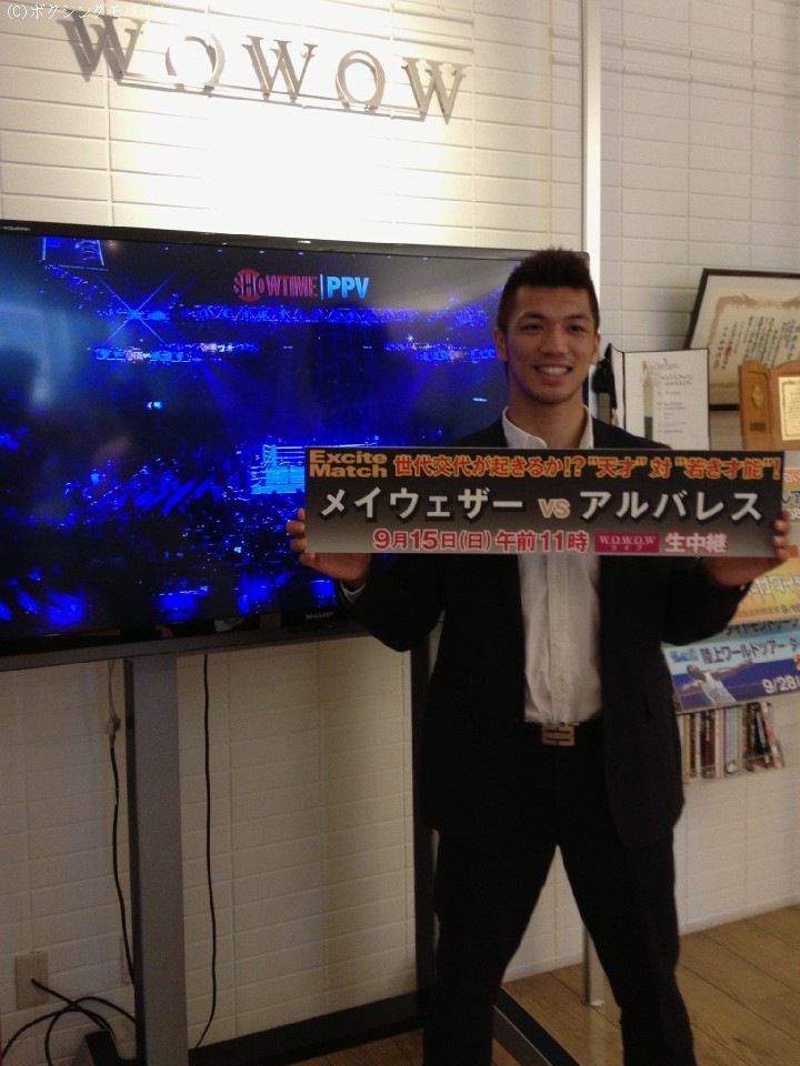 スピードとスキルで若いアルバレスを圧倒しながらも、ジャッジひとりが114対114のイーブンとつける2対0の判定勝ち。「僕は117対111でメイウェザーでした」と村田は自己採点を明かした。「メイウェザーは技術はすごいんですが、やっぱり攻めないので」とも。もし自分が戦うとしたらという問いには「来るところを相打ちするしかないんじゃないですか。スピードがありすぎて、それができないんでしょうが」と、打つ手なしといった様子だった。