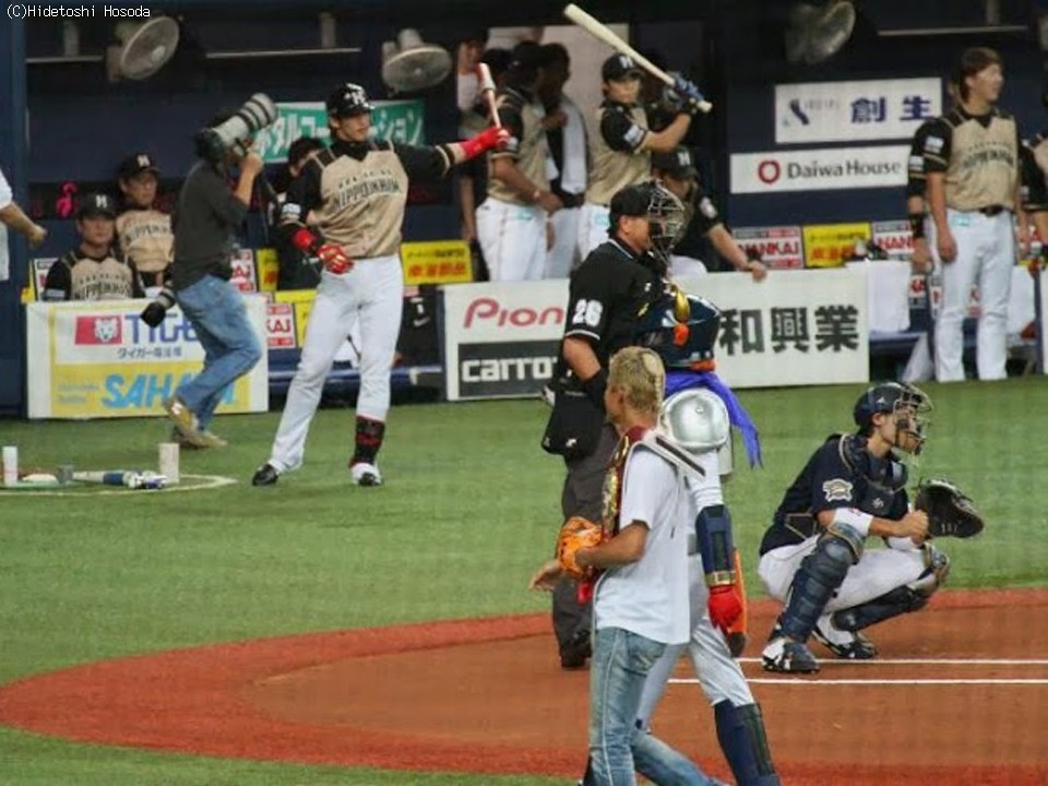 チャンピオンベルトを肩にかけ背番号「3」のユニホームで登場した和毅は、高目ながらノーバウンドでの投球を披露。始球式後には、「いつか、ここで3兄弟で試合がしたい」と夢を語った。