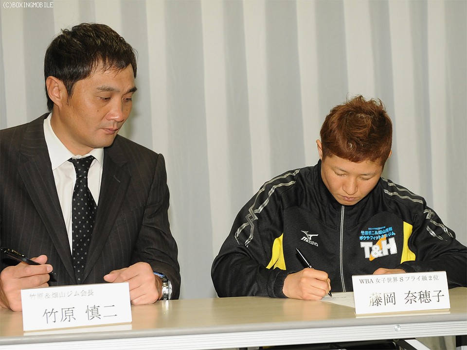 女子最強決戦を明日に控えた12日、東京・後楽園ホールの展示会場でWBA女子世界スーパーフライ級タイトルマッチの調印式が行われた。笑顔で会見場に現れた王者の山口直子(35=白井・具志堅)とは対象的に、元WBC女子世界ミニフライ級王者で現WBAスーパーフライ級2位の藤岡奈穂子(38=竹原&畑山)は、若干強張った表情で会見に臨んだ。