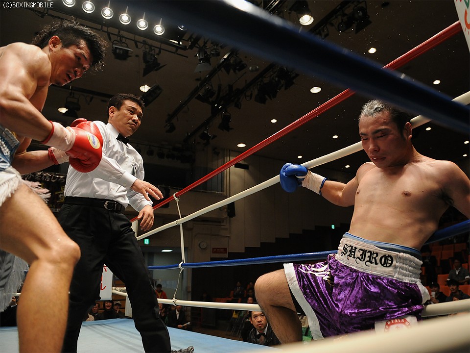 身長差のある相手に前半はなかなかペースを掴めないでいた飛天だが、それでも4Rにアッパーから打ち下ろしの左でダウンを奪うと、ここから流れを引き寄せた。続く5Rはロープに詰まったところで打ち合いとなり、齋藤のフックにバランスを崩して倒れてしまったが、齋藤に左ストレート、ボディでダメージを与え続けると最後は7R、連打でコーナーに追い込み左で倒した。