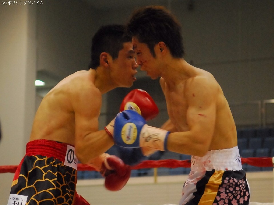実力差は歴然だった。序盤積極的に仕掛ける長谷川に対して王者・大場は、得意のL字ガードを駆使し隙を見せない。1R、2Rと鮮やかなカウンターでダウンを奪う大場は、4R終盤、接近したところに右アッパーを合わせ3度目のダウンを奪うと長谷川陣営からタオルが投入され決着がついた。
