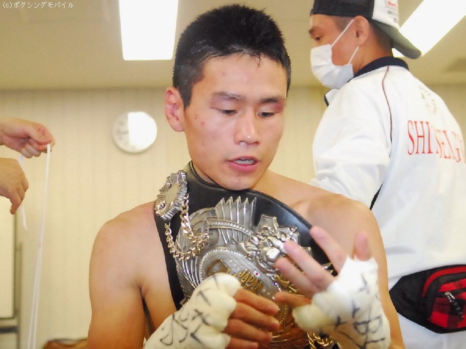 試合後、3度目の防衛を果たした王者・大場は会場に集まった大勢のファンや後援会関係者に囲まれ記念撮影に応えると、30分程して控え室に戻った。「とりあえず今回の試合は内容よりも結果を求めていたので勝てて良かったです」と安堵の表情を見せ「長谷川選手には研究されていました。1Rでダウンをとった時に逆に倒さなければと固くなってしまいした」と反省点をあげ「世界に行くにはそこをもっと修正しなければいけないですね」と次戦への意欲を見せて会見を終えた。