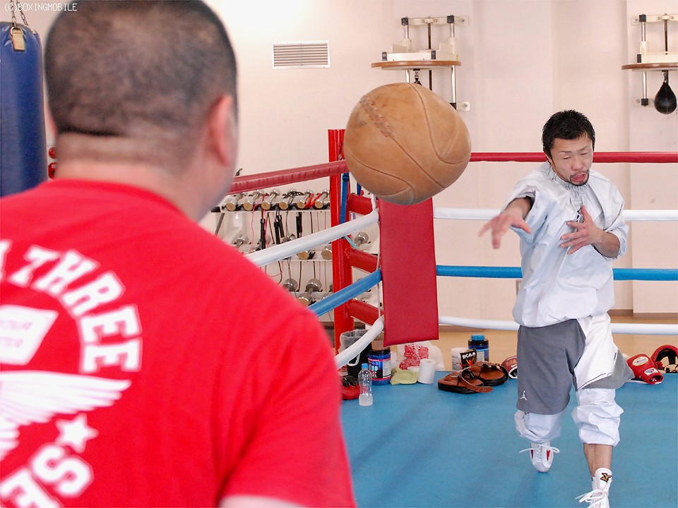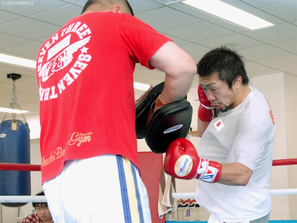 練習に移り、同門の前日本ミニマム級王者、原隆二(23)と2Rのスパーリングを行った八重樫は、原を仮想ソーサに見立てると距離を意識した出入りのボクシングで上下にパンチをまとめていた。