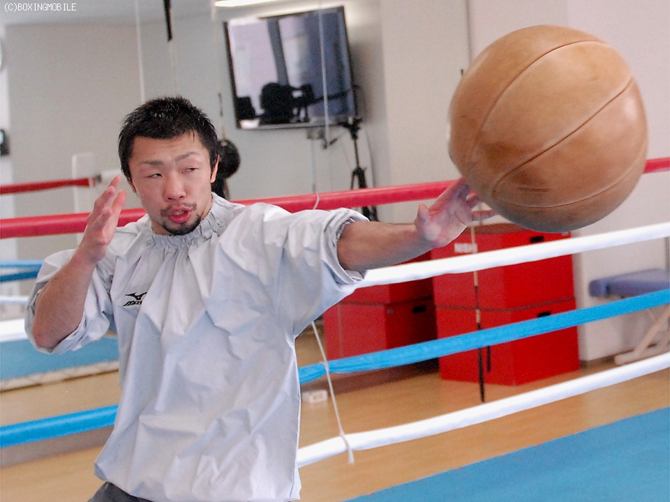 万全な仕上がりはミット打ちで示された。サウナスーツを脱ぐと恐ろしくキレのあるストレート、強烈な左フックをミットに叩き込み、ジムに乾いた音が響き渡った。締めは、重量のあるボディボールを押し出すように投げるトレーニングで最後の汗を流した。
