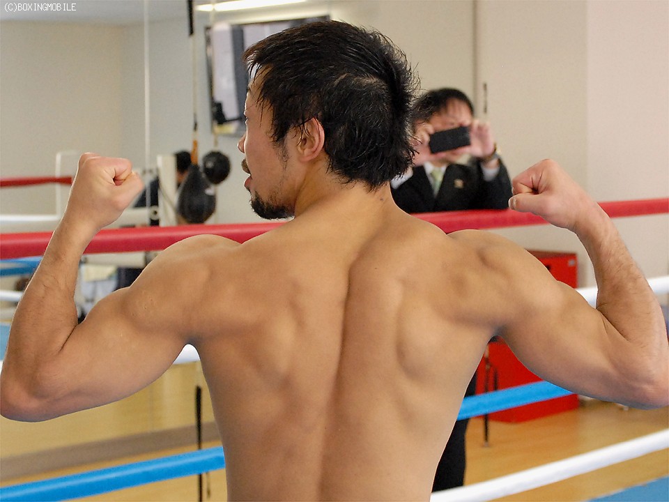 今年に入りミニマム級からフライ級に転級した八重樫は、身長差をカバーすべく、世界王者の内山高志(ワタナベ)のフィジカルトレーナーとしても有名な土居進氏に指導を受け、この1年でフライ級でも見劣りしない肉体を作り上げた。さらに、これまで以上にジム内外のトップ選手とスパーリングを重ね、パワー強化はもちろん、スピード、スタミナもレベルアップをはたした。それを証明するかのように、練習後は報道陣に鍛え上げた広背筋を自信たっぷりに披露する一幕もあった。
