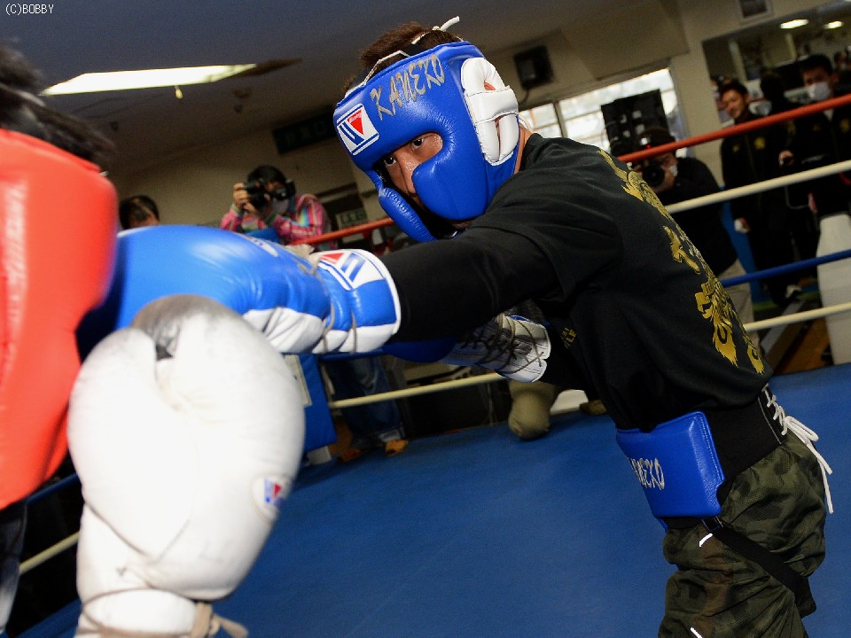 1ラウンドの公開スパーとミット打ちで右ストレートと左ボディの軌道を確認した金子は、当時のWBC世界スーパーフライ級王者、佐藤洋太(元協栄)に同門の赤穂亮が挑戦した昨年の大晦日を振り返り「来年は自分が世界挑戦するんだと思って、心の準備をしてきた」と、不利と予想される下馬評を一掃した。