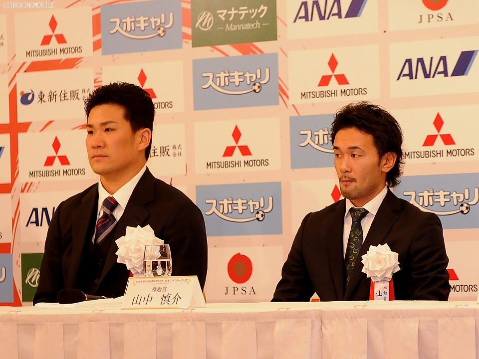 昨日の報知プロスポーツ大賞に続き表彰式の壇上に上がった山中は「今年は3試合3KOと満足のいく成績でした。来年はもっといい成績を残せるようにがんばります」と2013年を振り返った。また、2年前に新人賞を受賞した経験がある山中は「一昨年の新人賞をいただいたときとは違う会場に来た感じ。あの時はスピーチすることもなかったですし、記者会見もなかった」と、今年受け取った賞の重みを口にした。昨日も顔を合わせた田中将大投手(東北楽天ゴールデンイーグルス)と連絡先の交換をしたかと聞かれ「してないです。知り合いのつもりで勝手にいますけど、お互いが活躍すれば、また会うと思います」と、2014年には米国のリングに上がる可能性をほのめかした。