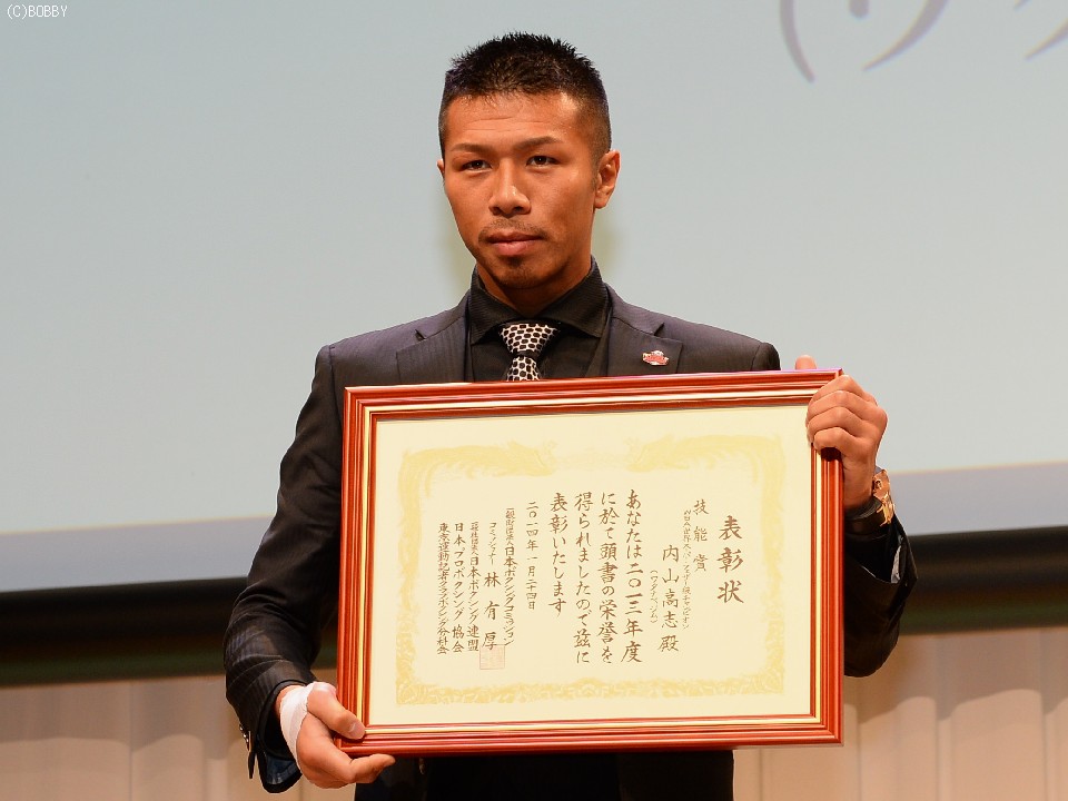 年間最高試合賞と技能賞のダブル受賞をはたした内山高志(ワタナベ)は「年間最高試合を受賞するということは、いい試合をしてしまったということ。圧倒的な試合ではなかったということなので悔しさもある」と、複雑な表情を浮かべた。