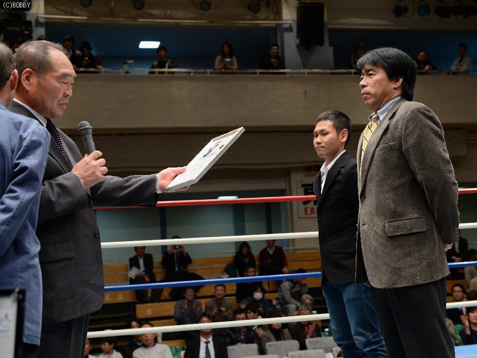 30日、後楽園ホールで年間最優秀トレーナー賞とも言えるエディタウンゼント賞の表彰式が行われ、受賞者の中出博啓トレーナーに「エディタウンゼントを偲ぶ会」ガッツ石松会長から賞状と記念品が贈られた。