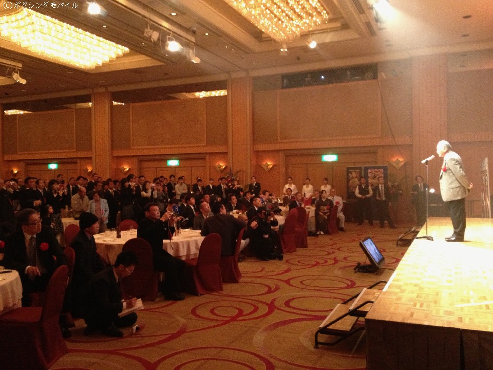 それだけにこの日の祝賀会には悪天候のなか日本ボクシングコミッションの林有厚コミッショナーや日本ボクシング連盟(旧アマ連)の山根明会長、大橋氏が現役時代に所属していたヨネクラジムの米倉健志会長らプロ、アマの重鎮のほか各方面から大勢の関係者が出席した。元世界王者ではヨネクラジムの先輩にあたるガッツ石松氏、柴田国明氏、中島成雄氏、後輩の川島郭志氏、さらに浜田剛史氏、西岡利晃氏、畑中清詞氏、セレス小林氏、畑山隆則氏、坂田健史氏、佐藤修氏、そして現役のWBA世界スーパーフェザー級王者の内山高志(ワタナベ)が出席した。