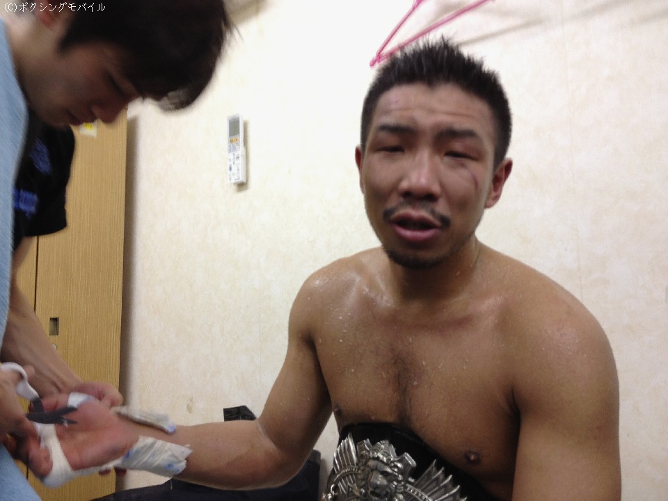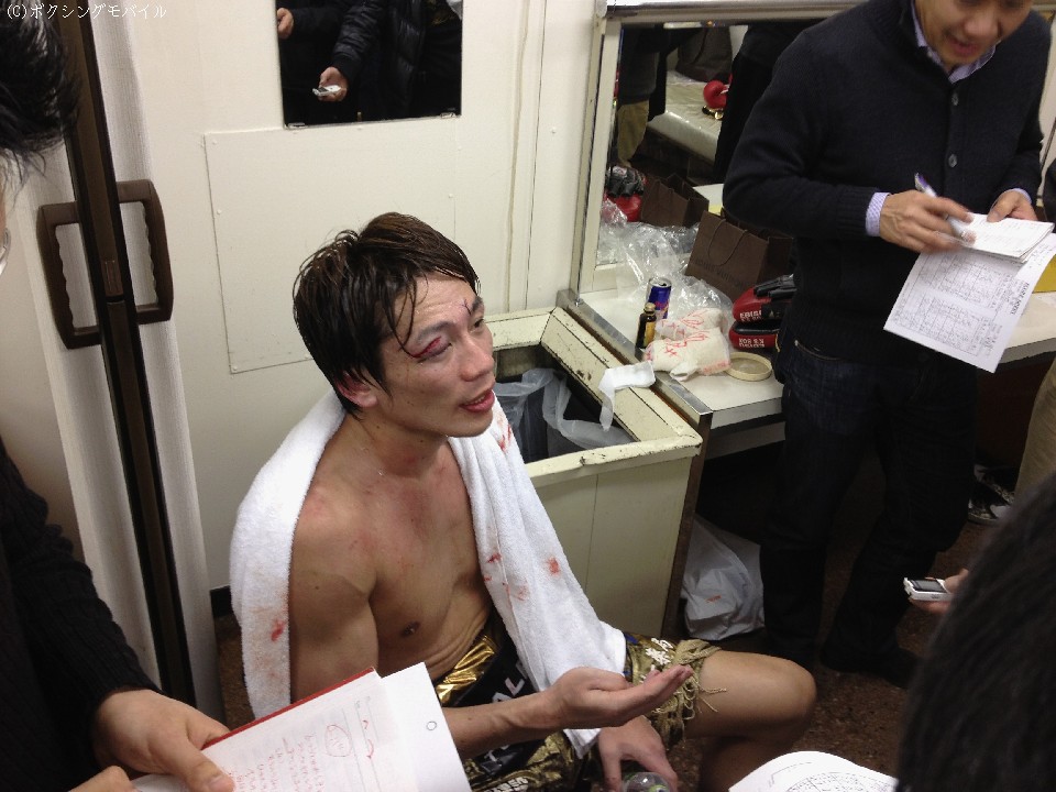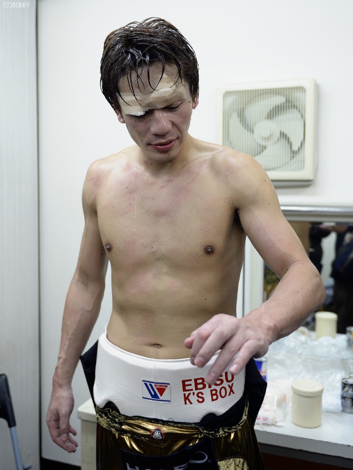 途中から右目がまったく見えなくなっていたという湯場は右目上を約3cm、かなり奥までカット。応急処置をした後、会見に応じた。「負けるときはこんなもんですよ。防衛戦は苦手ですね。特に2度目が」と話したとおり、日本5階級制覇王者は、これまで6度の戴冠のうち4度V2戦で敗れている。「どこかでモチベーションが落ちてしまうんでしょうね」とうなだれ、「どこかで倒せると思い、左をあてに行ってパンチが大きくなった。自分の弱さが出た」と試合を振り返った。