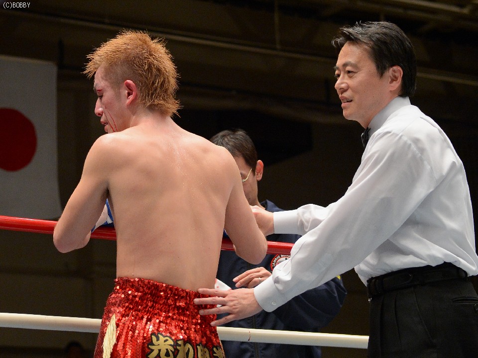 焦る斉藤が強引に距離を詰め、ワンツーの連打で山元を追い込むと、前にバランスを崩したところに右フックを入れ、引きずりながらもダウンを奪う。「それでもまだ2〜3ポイントリードしていると思った」と試合後に振り返った山元は、すぐに立ち上がり試合再開。斉藤は一気にラッシュを掛け、ガードの上からでもパンチを叩き込む。残り数十秒、それほど危険な場面とも思えなかった。だが、間近で見ていたレフェリーは、ロープを背負い打ち込まれる山元を危ないと判断。ゴング22秒前でストップをかけた。この判断にワタナベ陣営は猛抗議するも采配は覆らず、渡辺均会長は「後日正式に抗議文を送る」と憤りを見せた。7Rまでの採点は、69-65、69-64、68-65で山元がリードしていた。