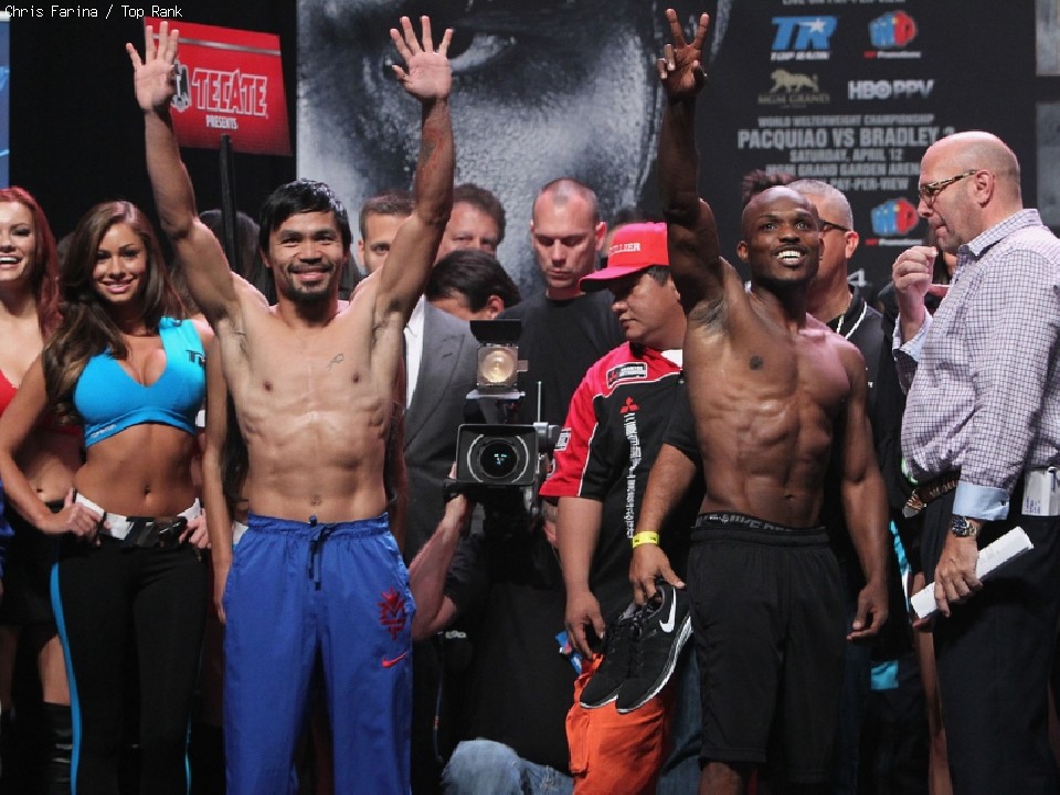 3度目の防衛を返り討ちを狙うブラッドリーは145.5ポンド(約65.9キロ)と、こちらも軽めに仕上げてきた。戦績はパッキャオが62戦55勝(38KO)5敗2分、ブラッドリーが32戦31勝(12KO)1無効試合。オッズは依然として7対4でパッキャオ有利と出ている。