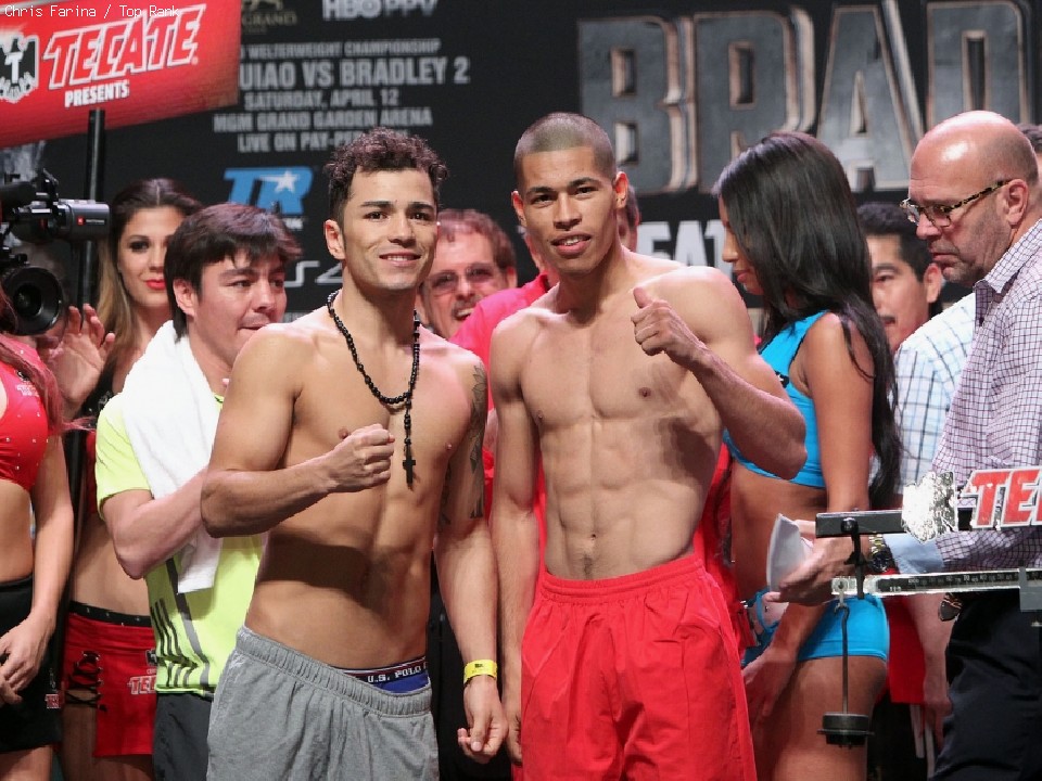 雪辱か、それとも返り討ちか――WBO世界ウェルター級タイトルマッチ、王者ティモシー・ブラッドリー(30=米)対6階級制覇の実績を持つ前王者マニー・パッキャオ(35=比)の12回戦は12日(日本時間13日)、米国ネバダ州ラスベガスのMGMグランドガーデン・アリーナで行われる。試合前日の11日、両選手とアンダーカードに出場するメンバーが現地で公式計量に臨んだ。