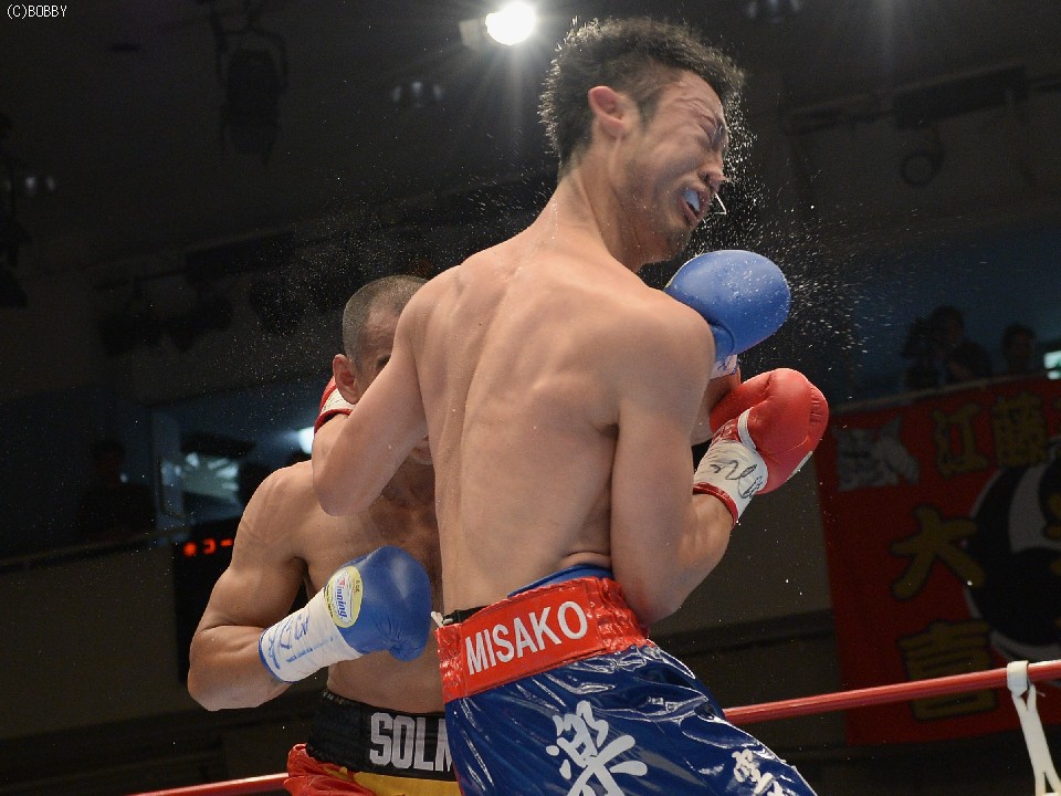 このクラスで抜群のテクニックを誇る小原は、上体でこの強打をかわすと、間髪入れずに右ストレートを打ち込み、序盤から激しい主導権争いが繰り広げられた。ソルミアノも左右のビッグパンチで小原を脅かし、3回には左を浴びせて倒すもこれはスリップと判断された。徐々に流れが相手に傾くなか、続く4Rに小原の左がカウンターで炸裂しソルミアノがダウン。カウント中に立ち上がるも、小原がラッシュでコーナーに追い込むと最後は右でキャンバスに沈んだ。今度はソルミアノも立ち上がれずにカウントアウト。小原が満員の観衆の中、圧巻のKO勝ちで空位のOPBF王座に就いた。