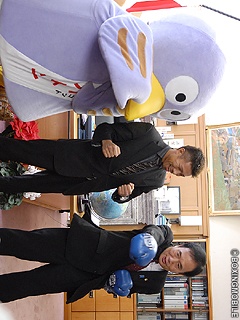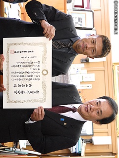 東京ビックサイトでサルガドを最終12R、劇的なTKO勝利で打ち破り、WBA世界スーパーフェザー級王座を奪取した内山高志(ワタナベ)。世界王座奪取の偉業を称え、内山の出身地である埼玉県から"彩の国スポーツ功労賞"が送られる事となり15日(金)、埼玉県庁で贈呈式が執り行われた。